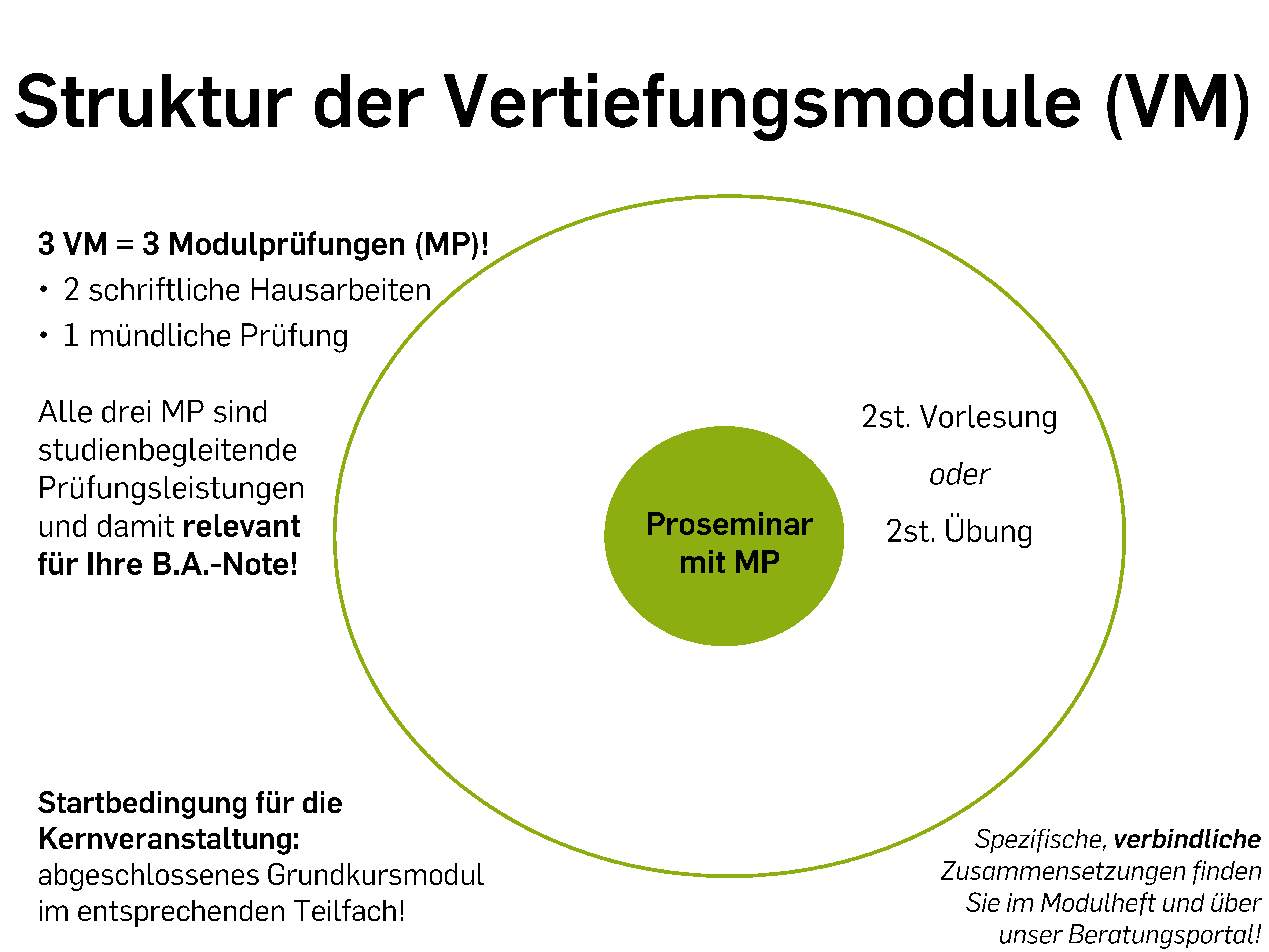 1. Kernveranstaltung (= Veranstaltung, in der Sie die Modulprüfung ablegen) ist bei VM stets ein Proseminar.